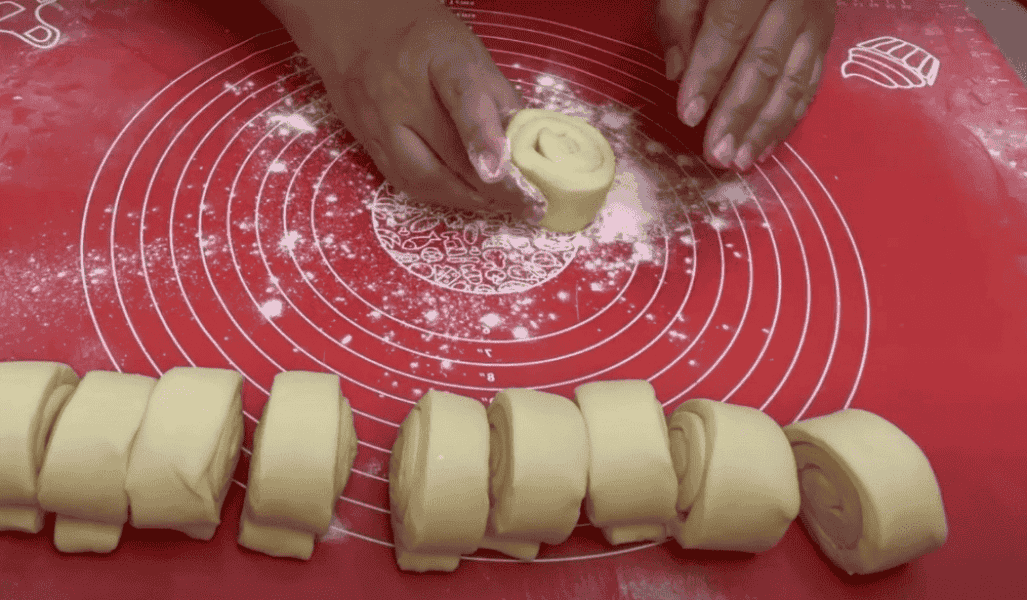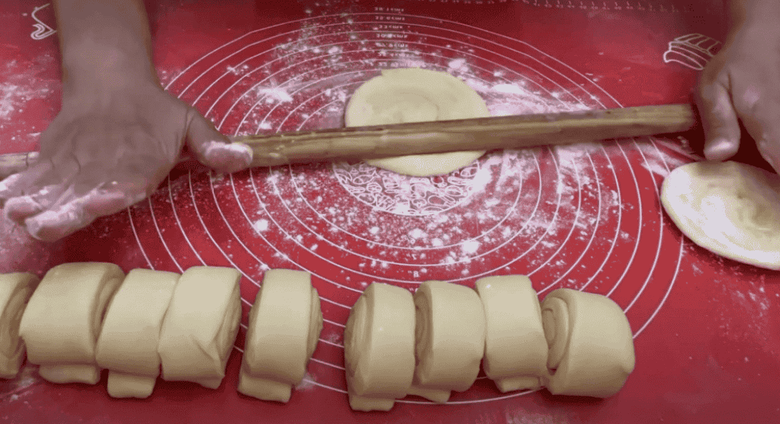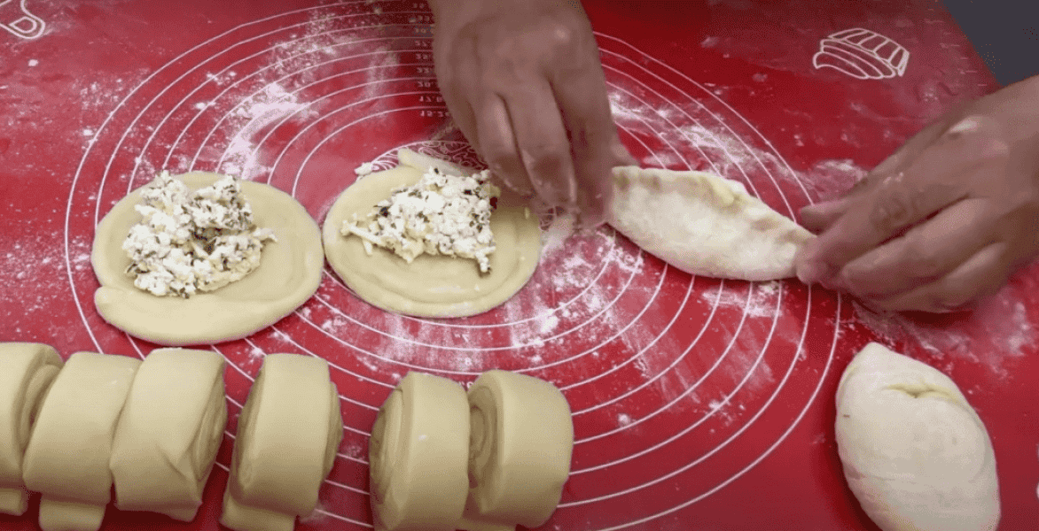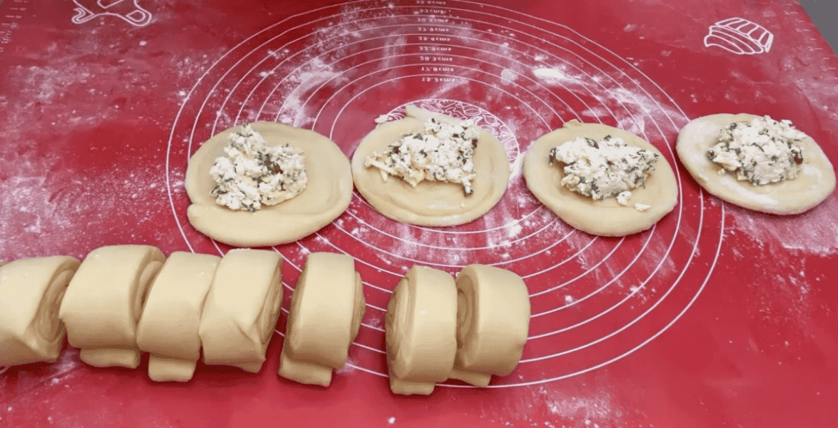 і отриману листкову заготівлю відкласти і знову розкачати другу кульку тіста змастити маслом, першу заготівлю помістити в центр і знову скласти так як в попередньому випадку і також з третім колобком тіста, потім розкачати листковий пласт, змастити маслом і загорнути в рулет, розділити на 12 частин, кожну розкачати, в центр викладаємо начинку