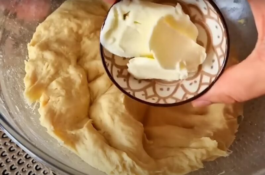 Висипаємо залишки борошна в тісто, продовжуємо замішувати руками еластичне м’яке тісто. Кладемо в тісто вершкове масло, вимішуємо його в тісті.