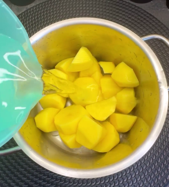 🔻Картоплю відварюємо, воду зливаємо, робимо картопляне пюре. Додаємо сир, яйце, приправи за смаком, борошно та розпушувач.