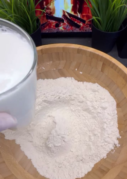 🔻Змішуємо борошно, сіль, цукор, ванільний цукор і розпушувач. Вливаємо теплий кефір та 1 ст л олії. Замішуємо тісто, що липне до рук.