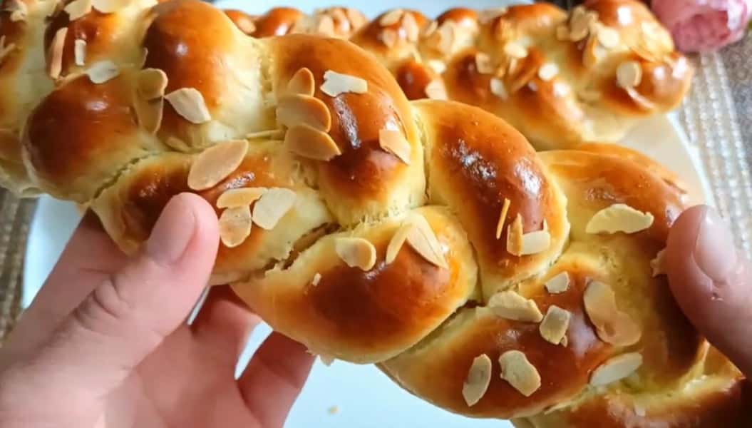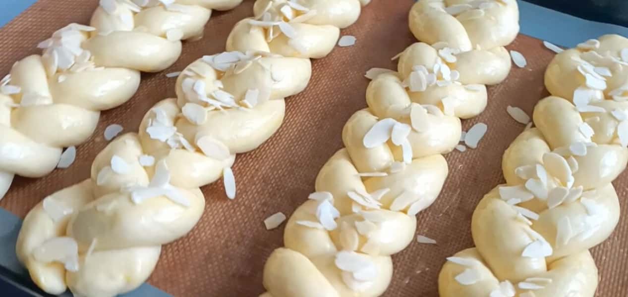 Змащуємо збитим яйцем і посипаємо пелюстками мигдалю.