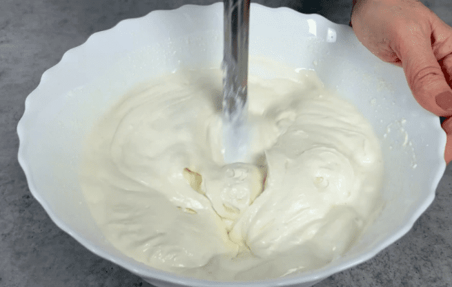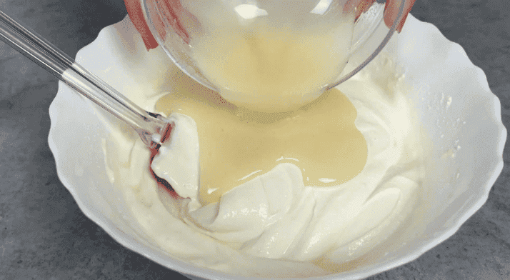 - Переливаємо розтоплений желатин у сир і збиваємо до однорідності, желатин повинен повністю змішатись із сиром.