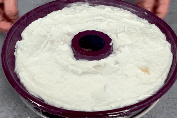 Перекладаємо у форму, накриваємо харчовою плівкою та прибираємо в холодильник на 2-3 години.