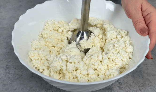 - Сир потрібно пробити занурювальним блендером до однорідної маси.
