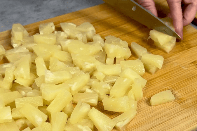 - Консервовані ананаси нарізаємо на шматочки, а сік переливаємо в кружку.
