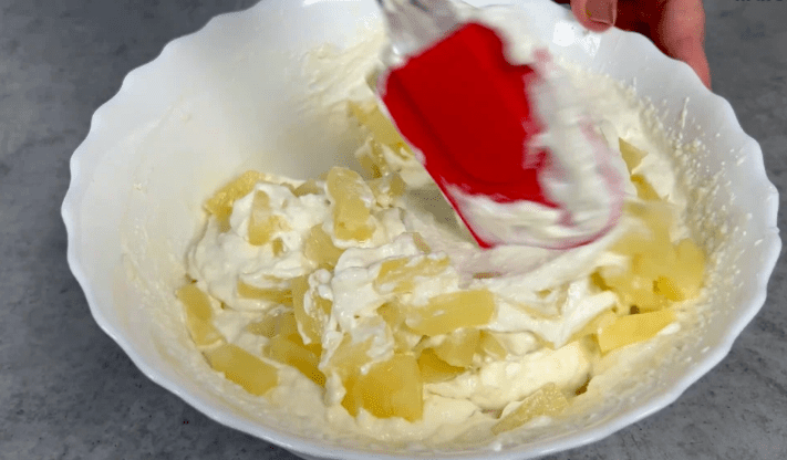 - Додаємо шматочки ананасів у сир і перемішуємо.