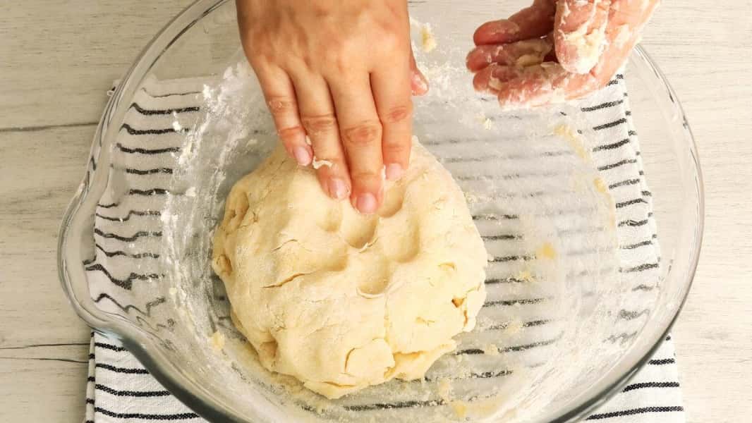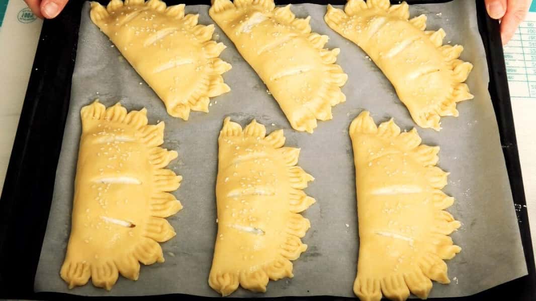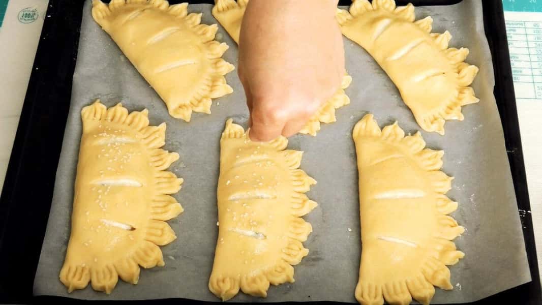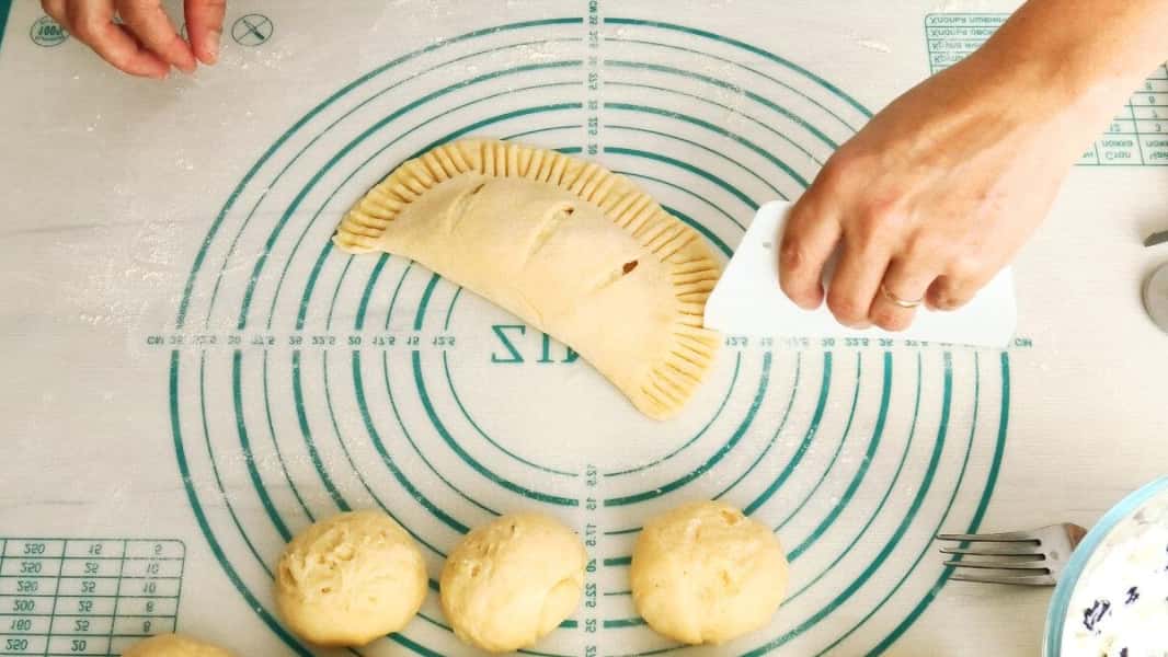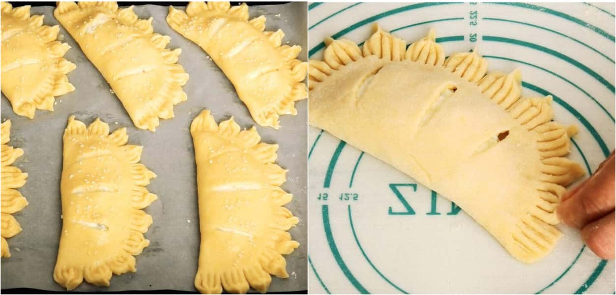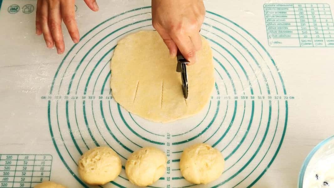 Кожну кульку розкачати в корж діаметром 15-16 см. На одній половині зробити три надрізу як на фото.