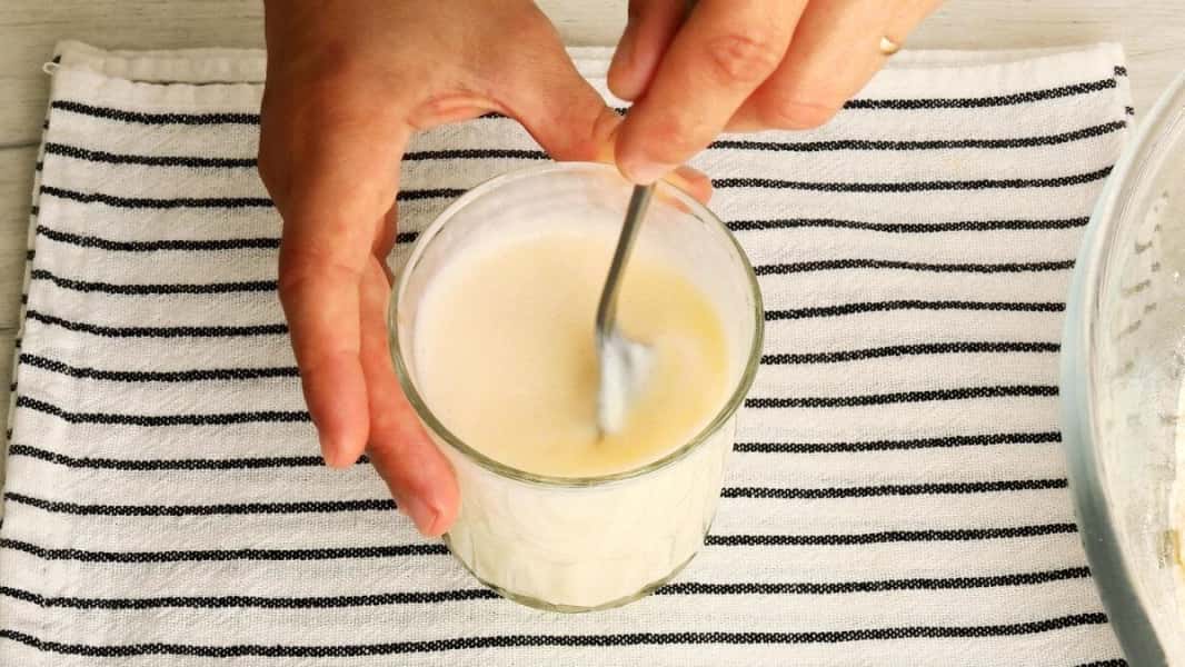У кефір додати цукор, ванільний цукор, сіль і яйце, все збовтати виделкою.