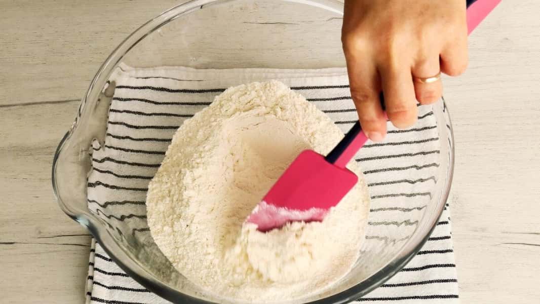 У миску висипати все борошно, додати розпушувач, перемішати.