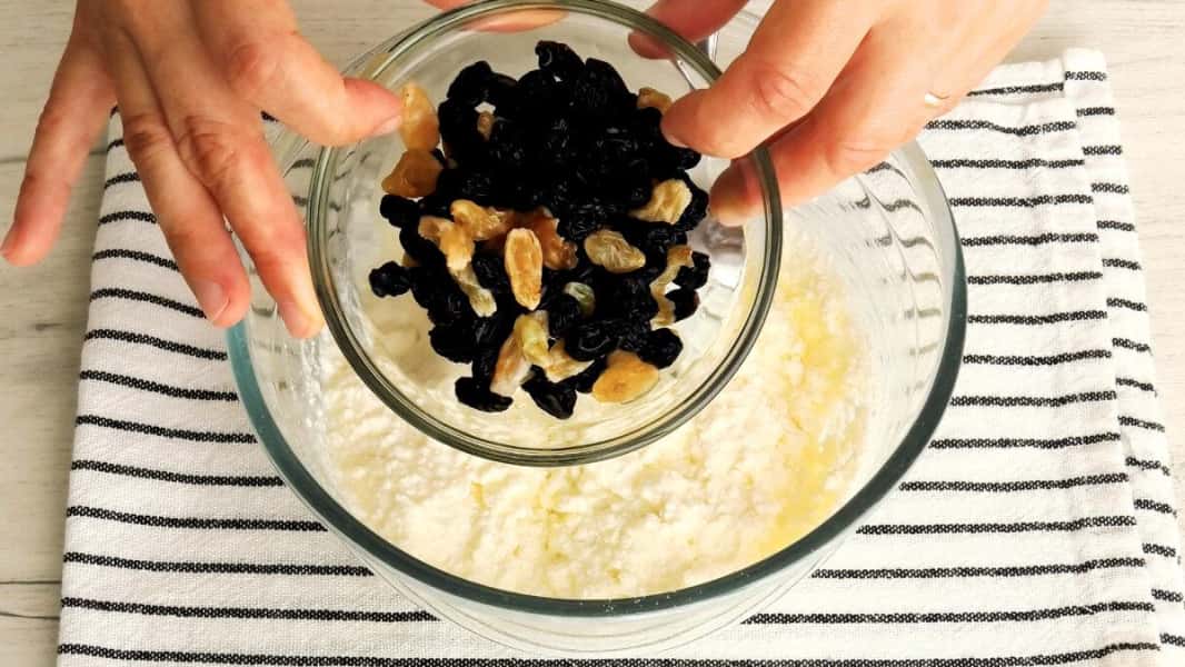 Додати промиті і просушені родзинки, перемішати. Начинка готова.