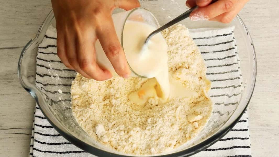 Влити цю суміш в борошно з маслом і замісити швидко тісто.
