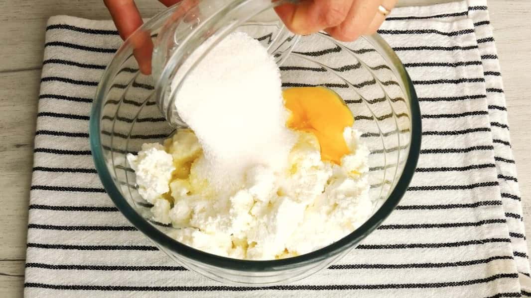 Для начинки з’єднати сир, цукор, ванільний цукор і яйце, перемішати.