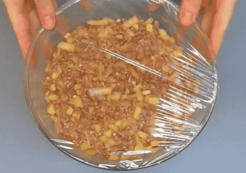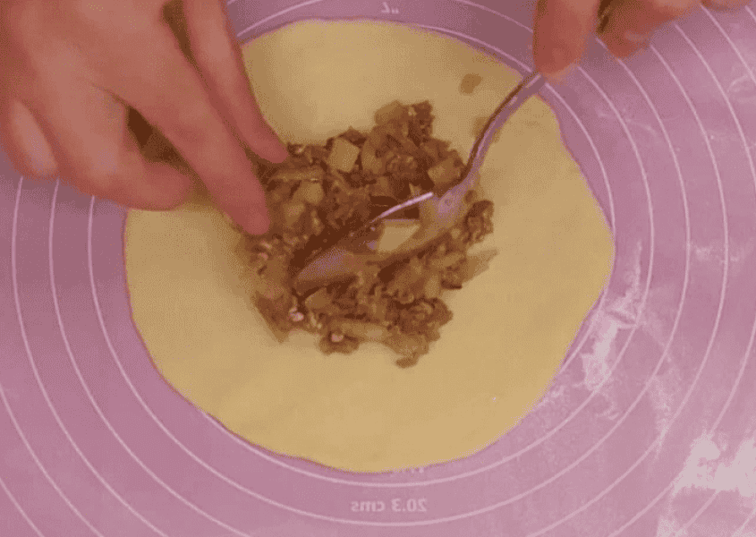 Поки піднімається тісто, робимо начинку: до фаршу додаємо дрібно порізану цибулю, порізану дрібними кубиками картоплю. Начинку можна зробити суто м’ясну, виключивши картоплю.