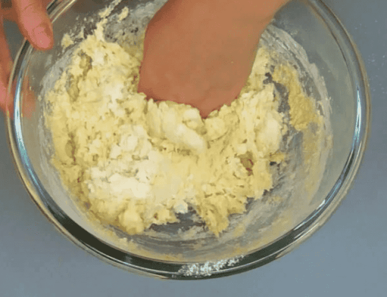 Далі додаємо яйце, розтоплене вершкове масло, сіль, все перемішуємо. Починаємо потроху вводити борошно. На цьому етапі я додаю в тісто лимонний сік – з ним готова випічка довше залишається м’якою і не черствіє. Але цей інгредієнт є не обов’язковим, його можна виключити.