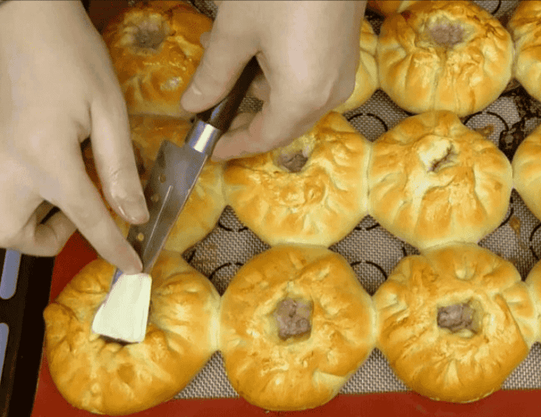 Коли біляші готові, я кладу на кожен із них (у серединку) невеликий шматочок вершкового масла для соковитості. Вершкове масло можна не додавати в готові біляші, а замість нього налити в отвори м’ясний бульйон (за хвилин 10 до готовності).
