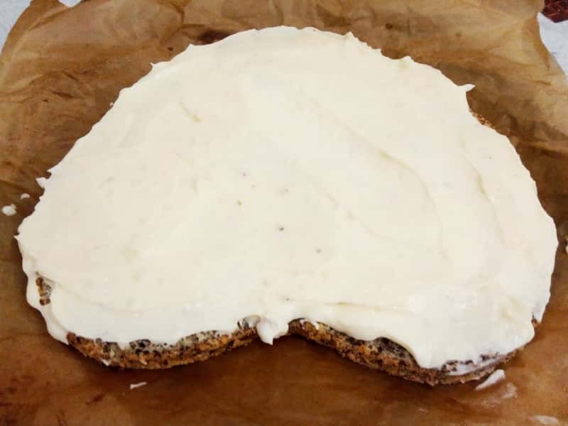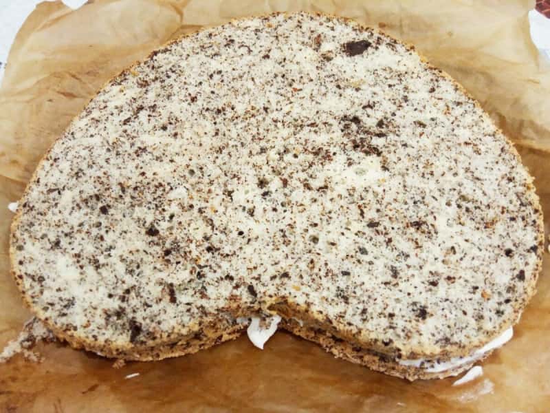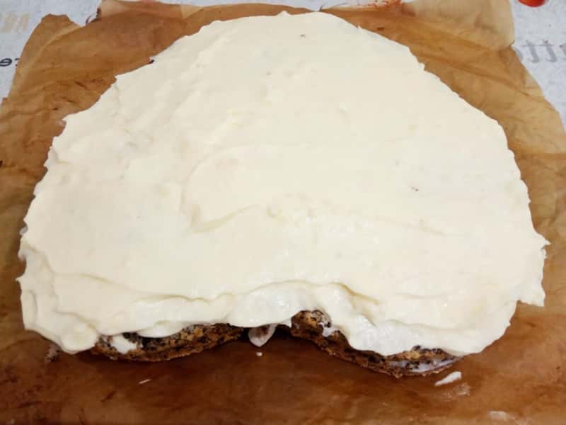 20. Кожну частину рівномірно промазуємо кремом, потім промазуємо боки торта.