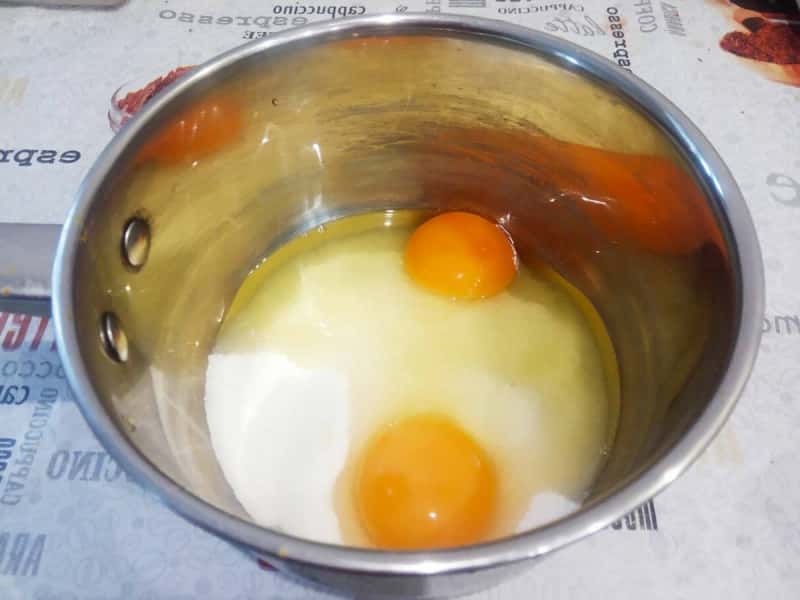 2. Розбиваємо в сотейник два яйця і ретельно вінчиком розтираємо.