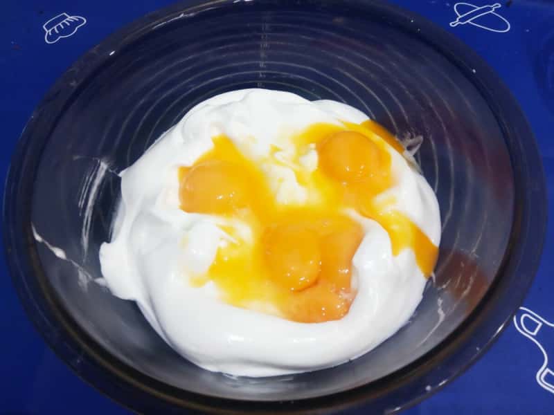 10. Викладаємо жовтки бажано по одному або по два, але я іноді викладаю все відразу і перемішуємо міксером на повільних оборотах.