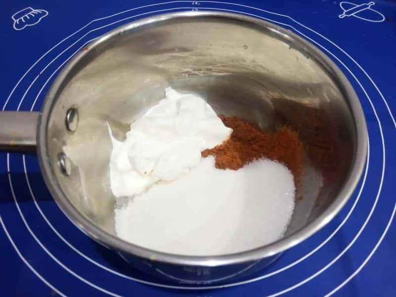 22. Для приготування шоколадної глазурі, з’єднуємо в сотейнику цукор, какао і сметану.