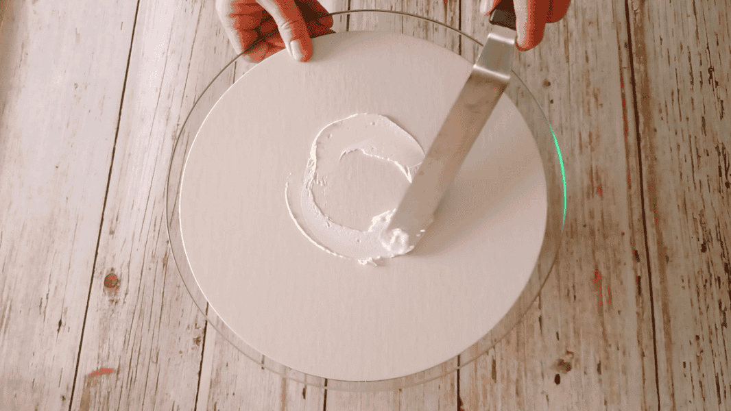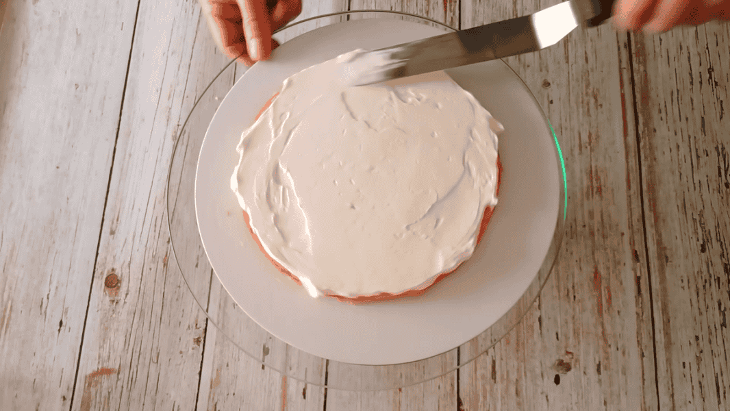 Зверху накладаю порцію крему. Розподіляю вершковий крем, плоскою палеткою по коржу. При відсутності палетки, можна скористатися тим же ножем, яким розподіляєте джем.