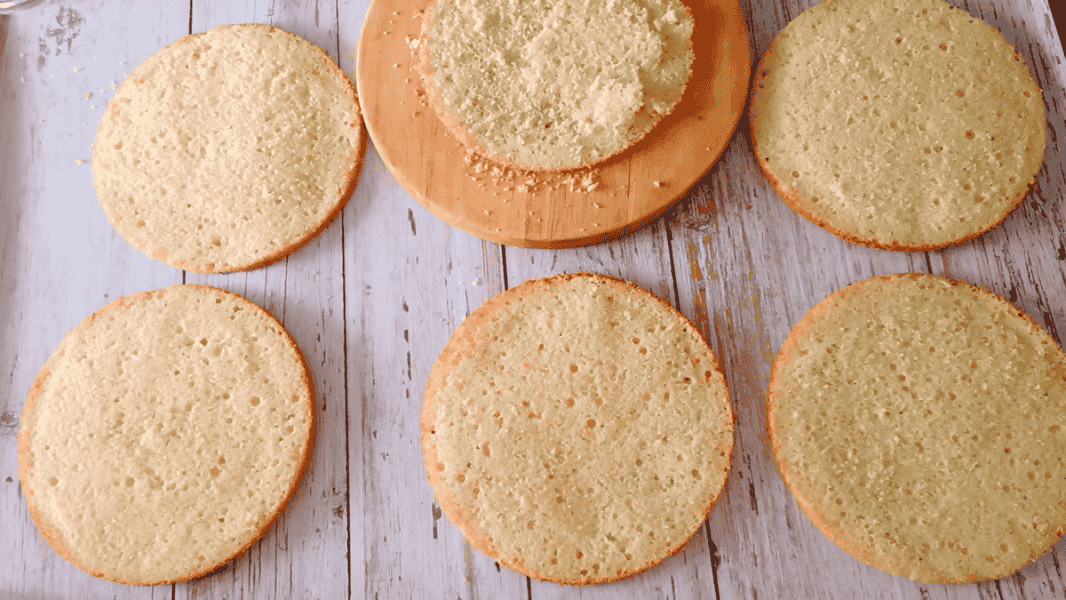 Попередньо остиглий і охолоджений в холодильнику бісквіт розрізаю на три рівні частини. Дуже важливо розрізати дуже холодний бісквіт, тоді вийдуть рівні і дуже тонкі коржі. Якщо немає ножа пили, скористайтеся довгим і гострим ножем. З другим бісквітом проробляю ідентичні маніпуляції. У підсумку вийшло 6 бісквітних коржів.