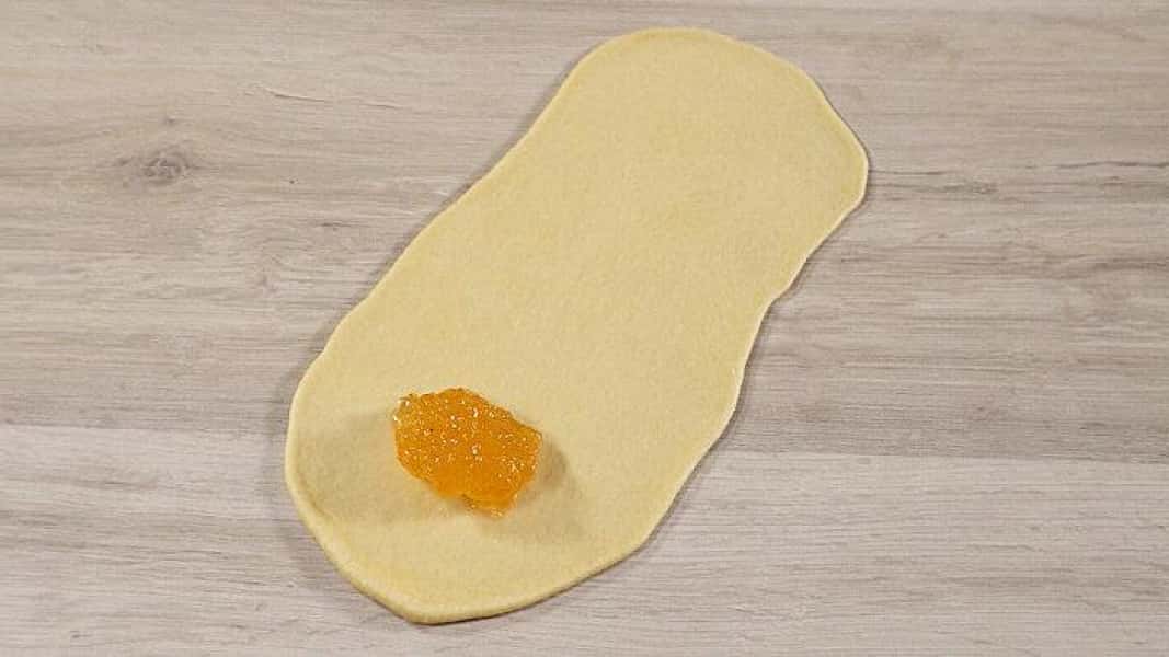 - Розкачуємо тісто, кладемо абрикосовий джем і загортаємо його.