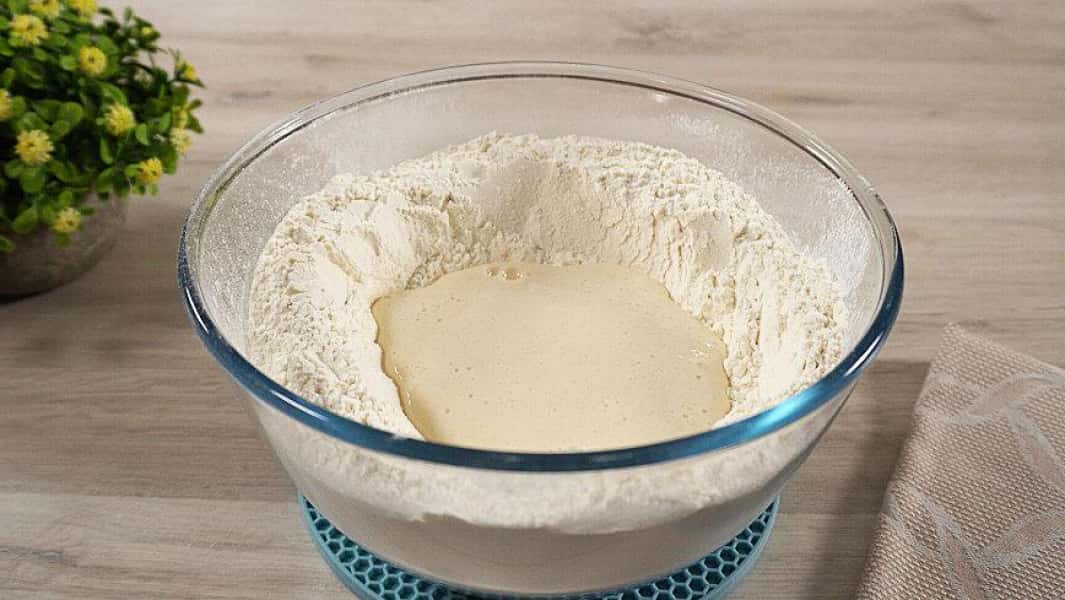 - Закваску додаємо в борошно.
