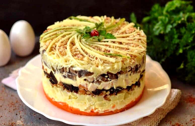 Торти301🍽️ Закусочний салат-торт з копченою куркою і чорносливом: готуємо красивий і дуже смачний салат шарами до будь-якого столу