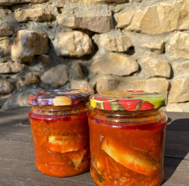 3. На дно чистих банок розкладаємо перці та лаврушку. Укладаємо чергуючи рибу та соус. До верху банки має залишитися 2-3 см!
