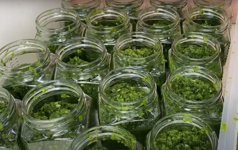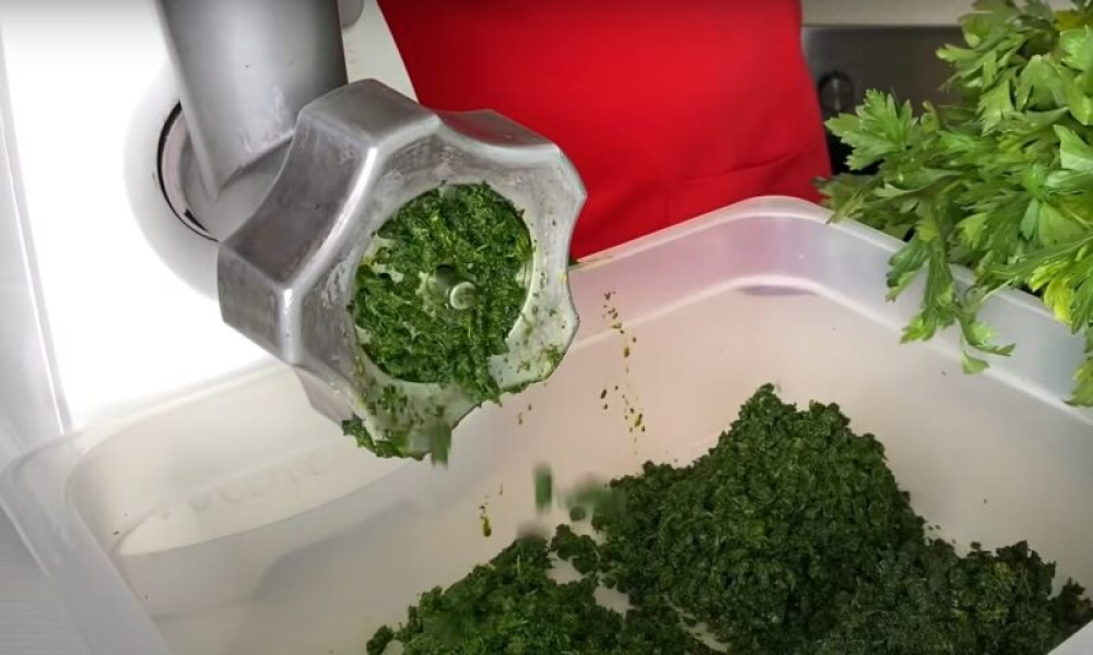 Пропускаємо один раз через м’ясорубку болгарський перець і чилі, часник. Змішуємо в одній тарі зелень з перемеленими перцями та часником.