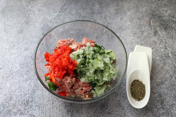 2. У глибоку ємність відправте фарш. Очистіть велику цибулину і разом з гострим і солодким перцем подрібніть погружним блендером. У цю ж кашицю додавайте зелень кінзи або петрушки. До фаршу додавайте подрібнену овочеву масу. Сухий базилік, сіль і суміш перців використовуйте на свій смак, додавайте в начинку.