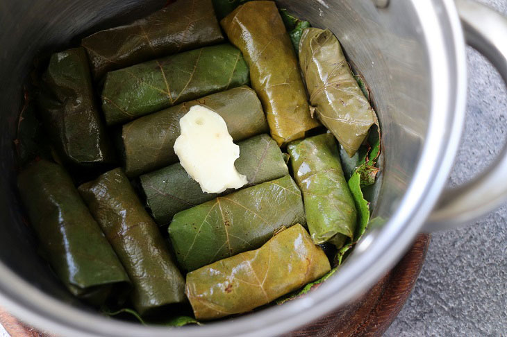 6. У каструлю з товстим дном покладіть кілька виноградних листочків, а потім викладайте щільно перший шар долми. Додавайте зверху кожного шару долми трохи вершкового масла.