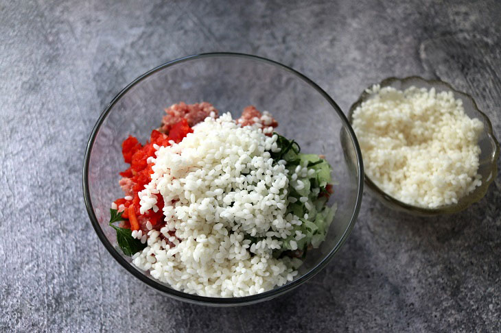 3. Сирий рис промийте і відправляйте в м’ясну начинку. Руками ретельно вимішуйте начинку для долми.