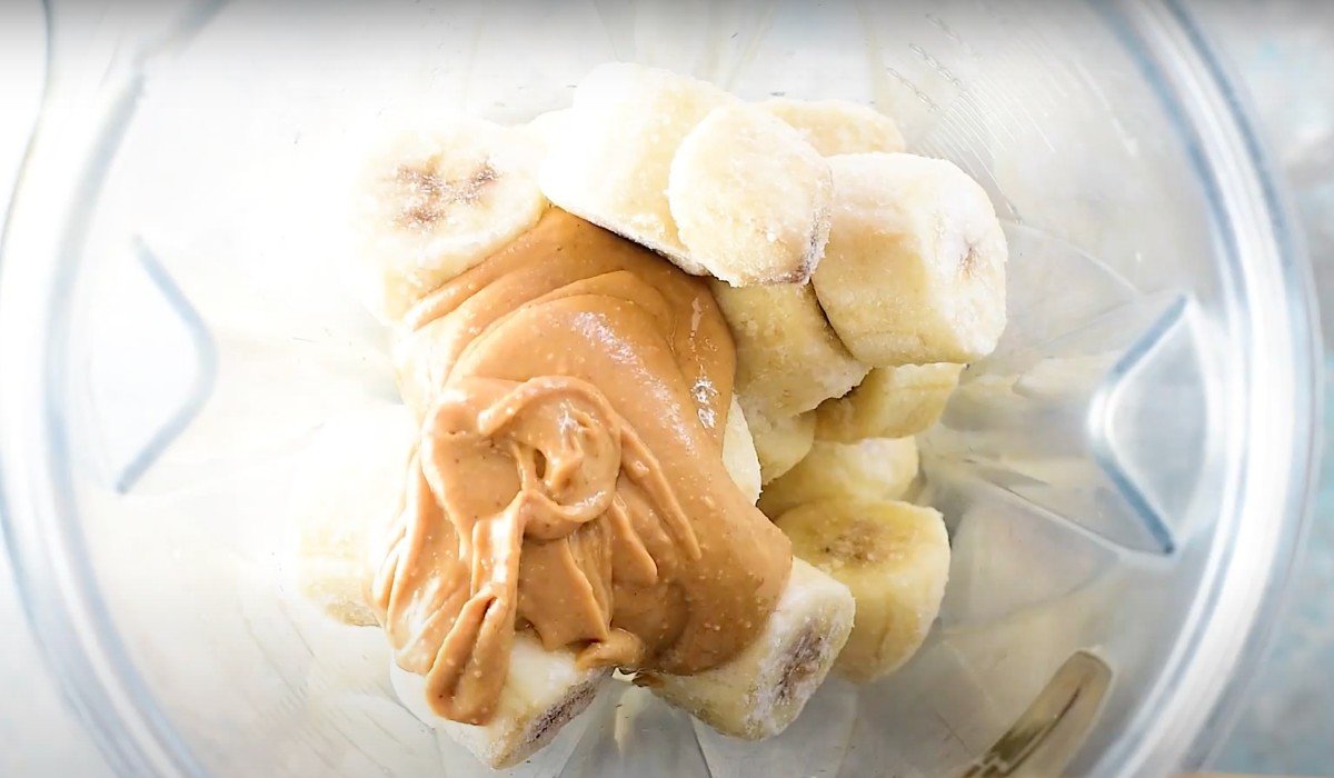 - Дістаньте банани з морозильної камери, покладіть їх у миску або глибоку тарілку і дайте трохи розморозитись. Потім відправте їх в чашу блендера.