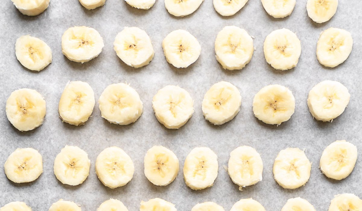 - Очистіть банани від шкірки і наріжте кружечками товщиною 0,5 см. Розкладіть шматочки на дошку, застелену пергаментом в один шар. Слідкуйте, щоб вони не торкалися один одного. Покладіть в морозилку і заморозьте до твердого стану (приблизно на 1 годину).