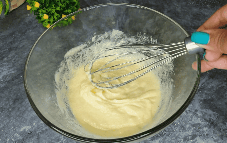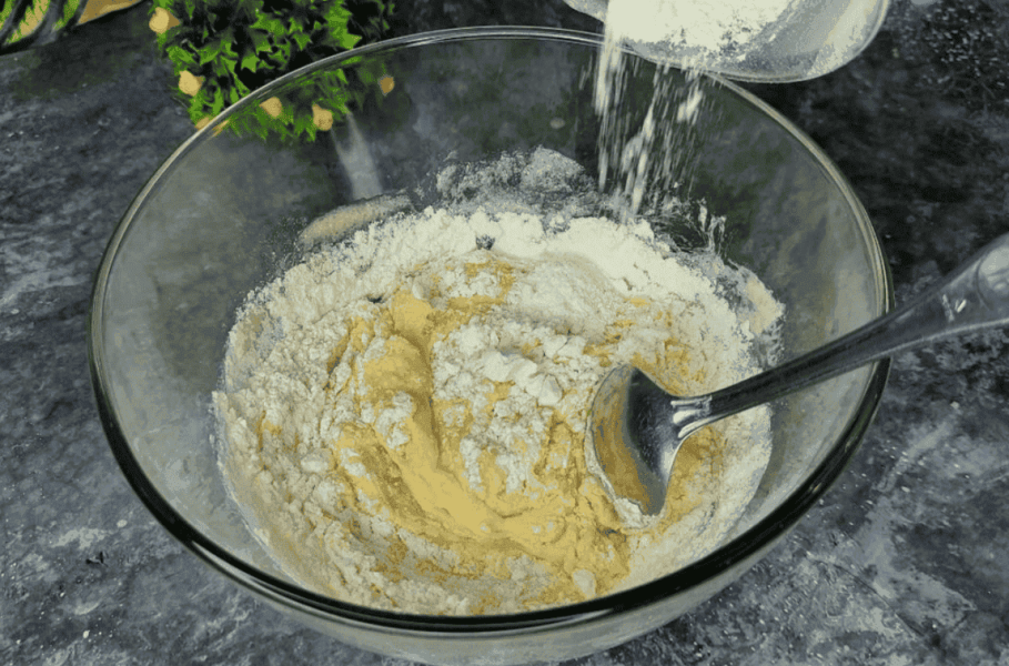 Потім додаємо поступово просіяне борошно та розпушувач. Розпушувач можна замінити содою, гасити оцтом.
