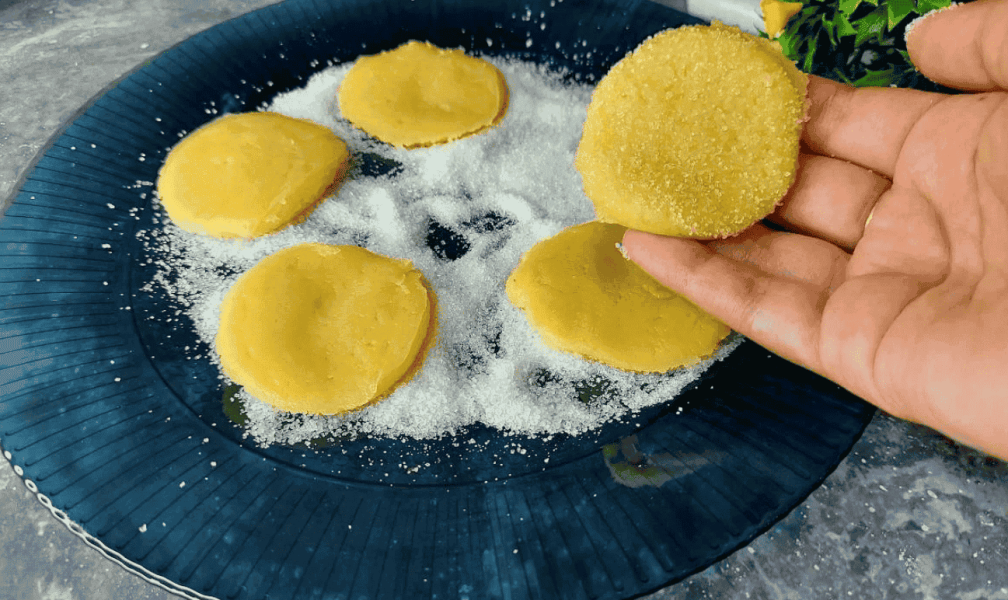 Кожне печиво обвалюємо в цукрі, з одного боку. Викладаємо на пергаментний папір.