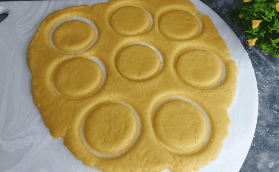 Розкачуємо тісто середньої товщини. За допомогою склянки чи форми вирізаємо печиво.