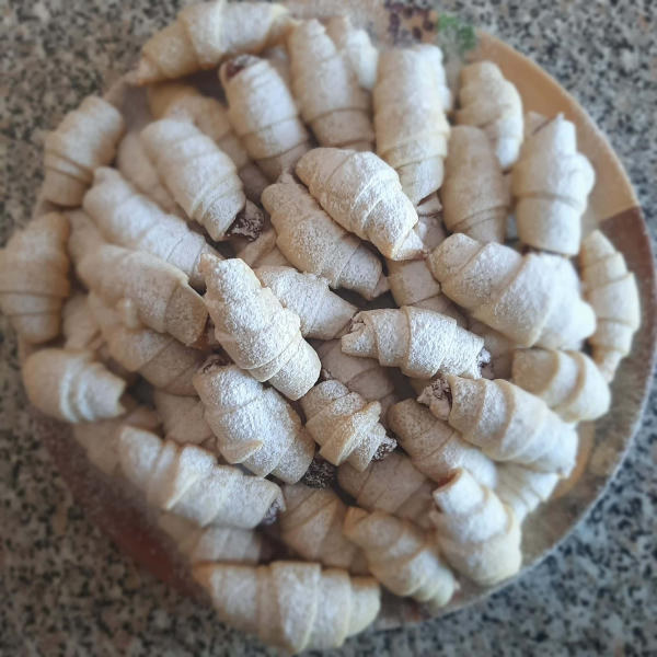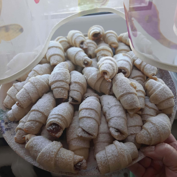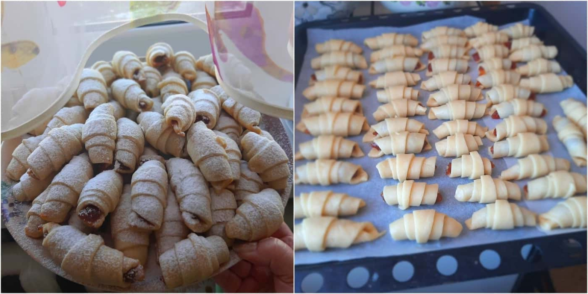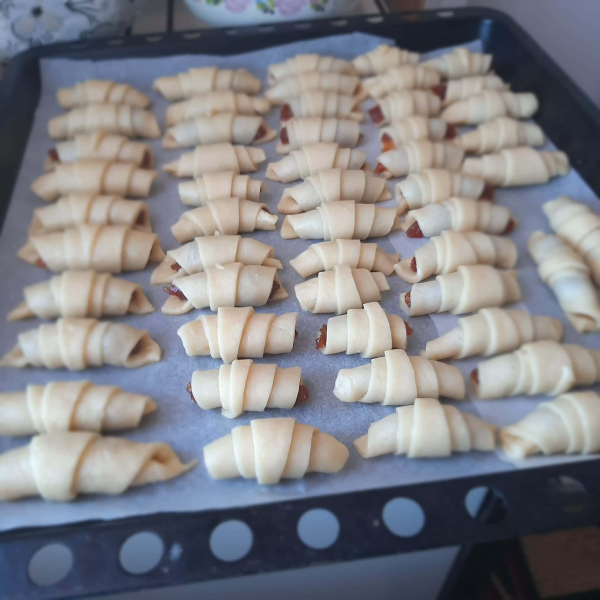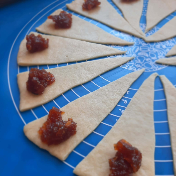 Розкачати, розділити на частинки, викласти начинку ( повідло густе), скрутити рогалики.