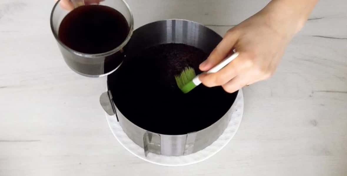 14. Збірка торта. На тарілку викласти корж, просочити трохи кавою.