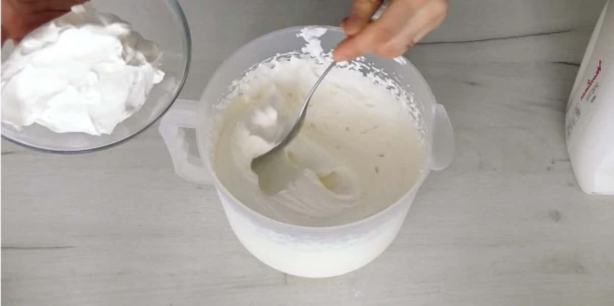 5. У три етапи додати білки, кожен раз добре вимішуючи ложкою.