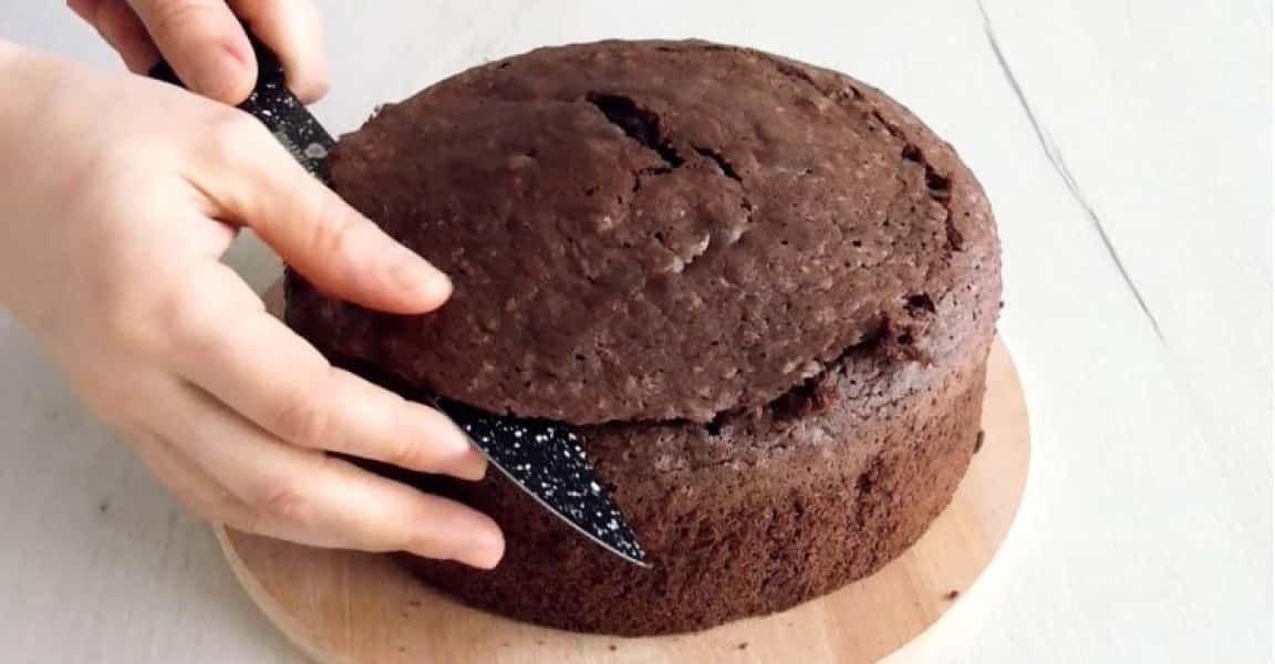 9. Бісквіт розрізати на три коржі будь-яким зручним для вас методом. Я це роблю ниткою або ножем.