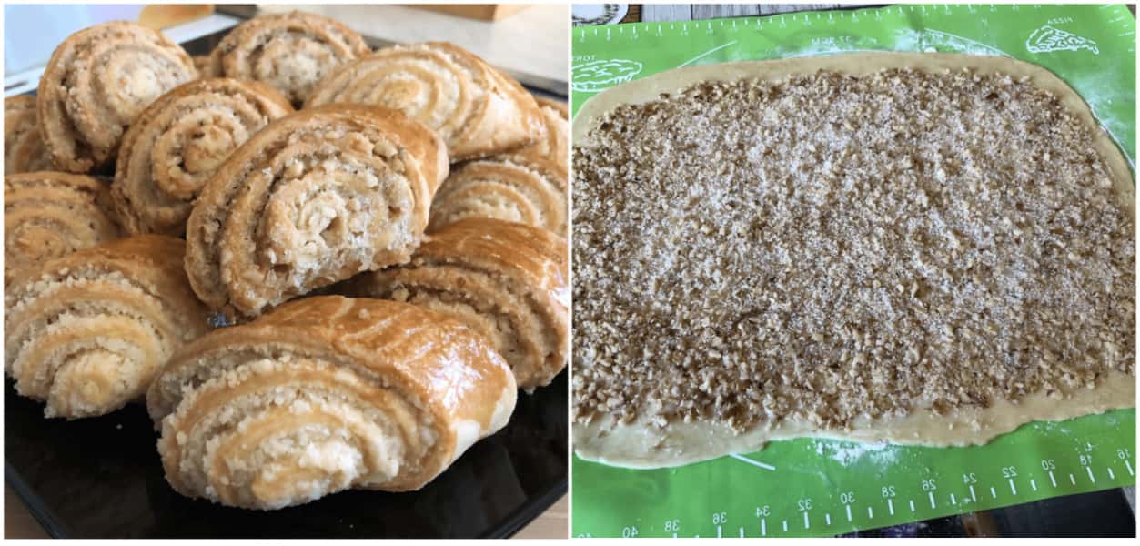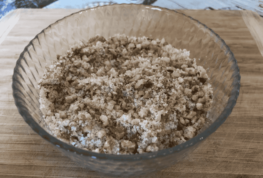 Поки тісто охолоджується, приготуємо начинку. Для першої начинки горіхи подрібнюємо в блендері або качалкою. До подрібнених горіхів додаємо цукор, кардамон та перемішуємо. Начинка готова!