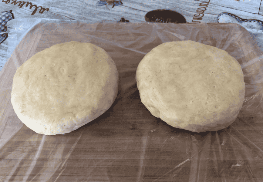 Готове тісто виходить м’яким і не липне до рук. Тісто ділимо на 2 частини. Кожну частину тіста обертаємо харчовою плівкою та прибираємо в холодильник на 30-40 хвилин.