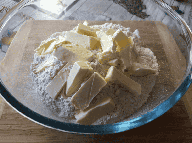 У миску додаємо борошно та холодне вершкове масло, порізане на шматочки. Перетираємо все руками до отримання масляної крихти, або натираємо масло на великій тертці, вмочуючи його в борошно. Однорідності домагатися не потрібно, якщо будуть десь шматочки вершкового масла, нічого страшного.