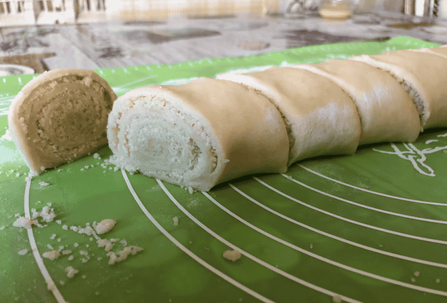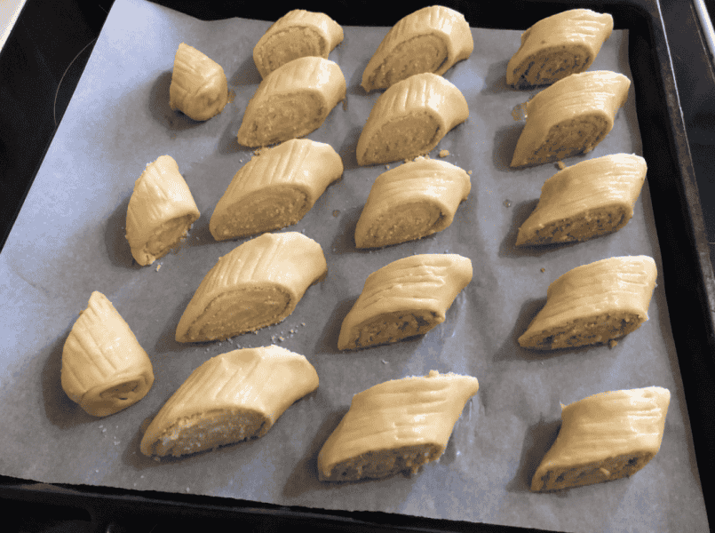 Рулет нарізаємо гострим ножем на шматочки 2-3 см. Розрізаємо печиво по діагоналі, щоб печиво було косої форми.