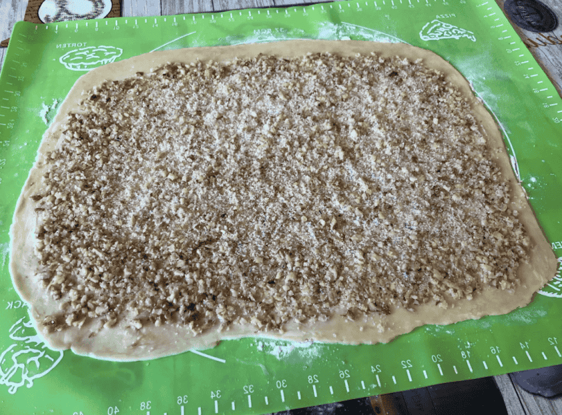 Для першої начинки змащуємо тісто невеликим шматочком розм’якшеного вершкового масла. Викладаємо горіхову начинку, злегка притискаючи її.