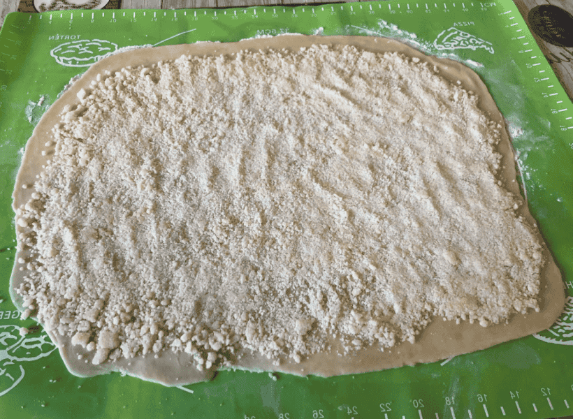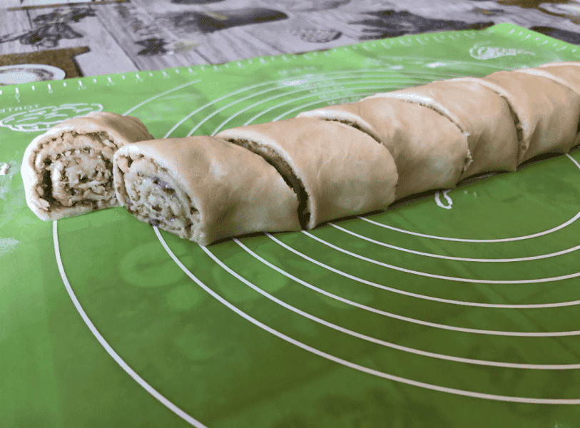 Зверху розподіляємо на тісто масляну крихту і злегка притискаємо ложкою. Також згортаємо у щільний рулет та нарізаємо на шматочки по діагоналі.