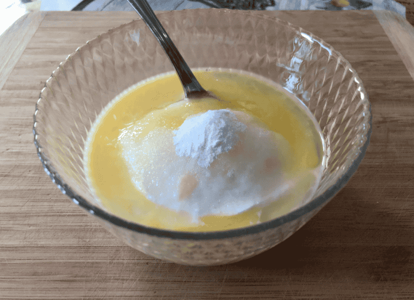 В окремій мисці змішуємо сметану, яйце, цукор, сіль та соду. Перемішуємо все вилочкою.