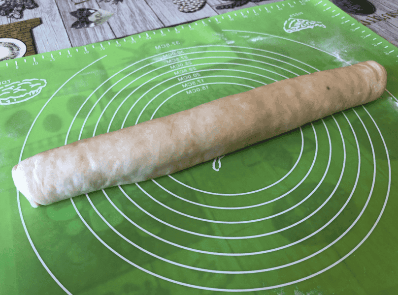 Згортаємо тісто в щільний рулет, защипуємо край і перевертаємо швом донизу.